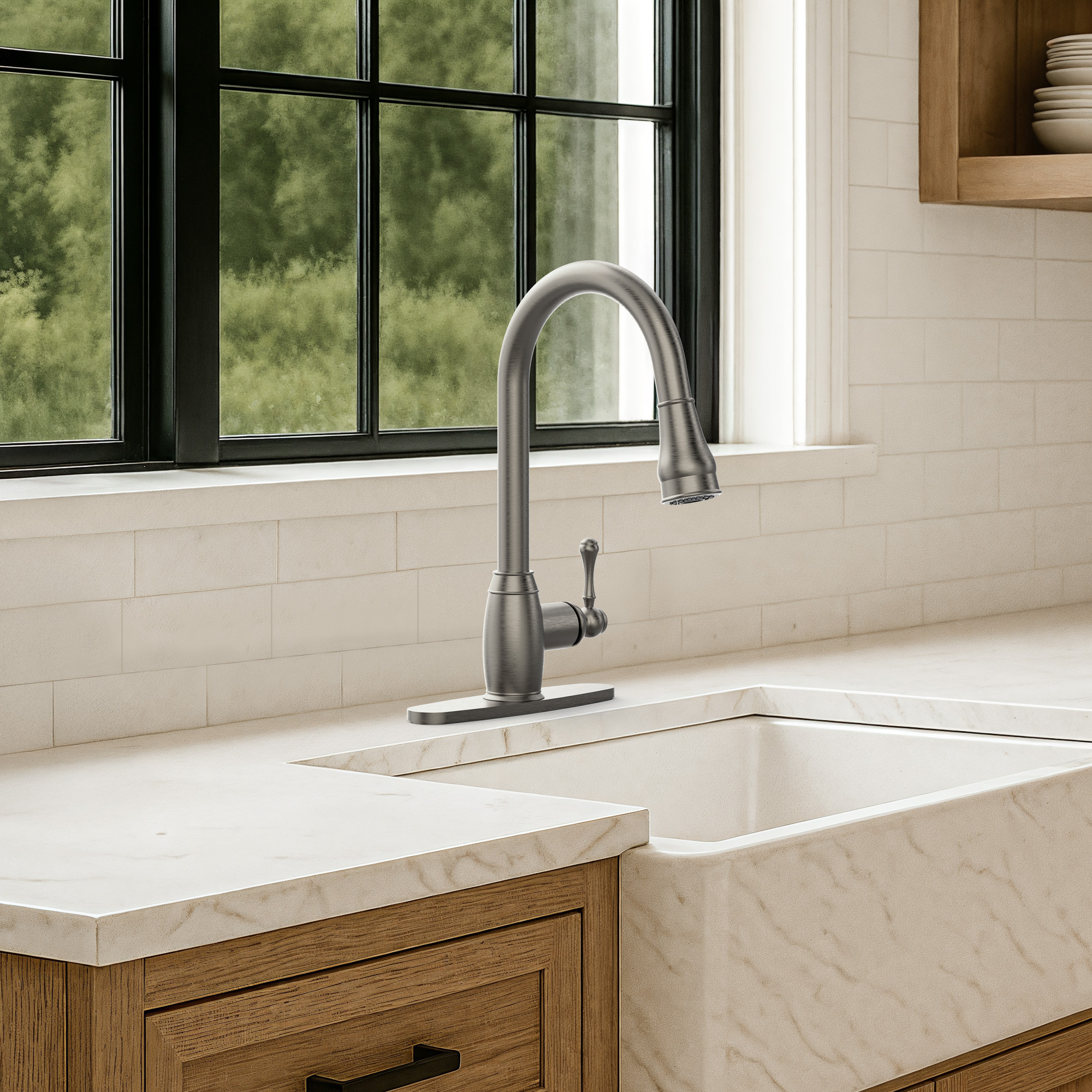 Refresh your kitchen with this elegantly designed pull-down faucet, where timeless style meets modern convenience. Tackle any task with ease using the dual-function spray head, switching from a gentle, aerated stream for filling to a powerful spray for rinsing with the simple push of a button. Combined with a 360° swivel spout and a spot-resistant finish, this faucet not only enhances your decor but also stands up to the demands of daily use, ensuring lasting beauty and performance.