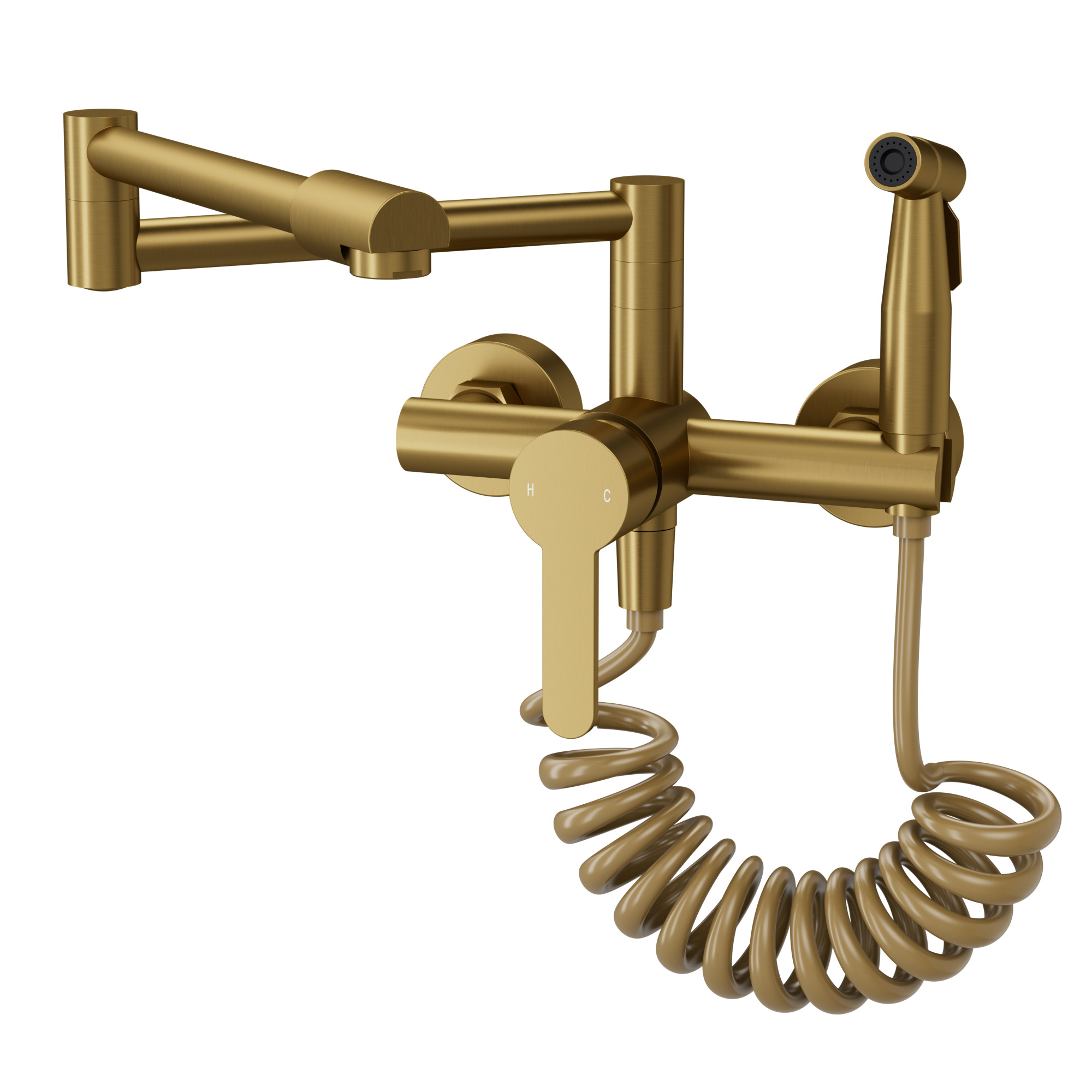 Wall Mount Folding Kitchen Faucet with Spray Gun, Dual Function Pot Filler Tap, 3.1 GPM Water Flow in Brushed Gold