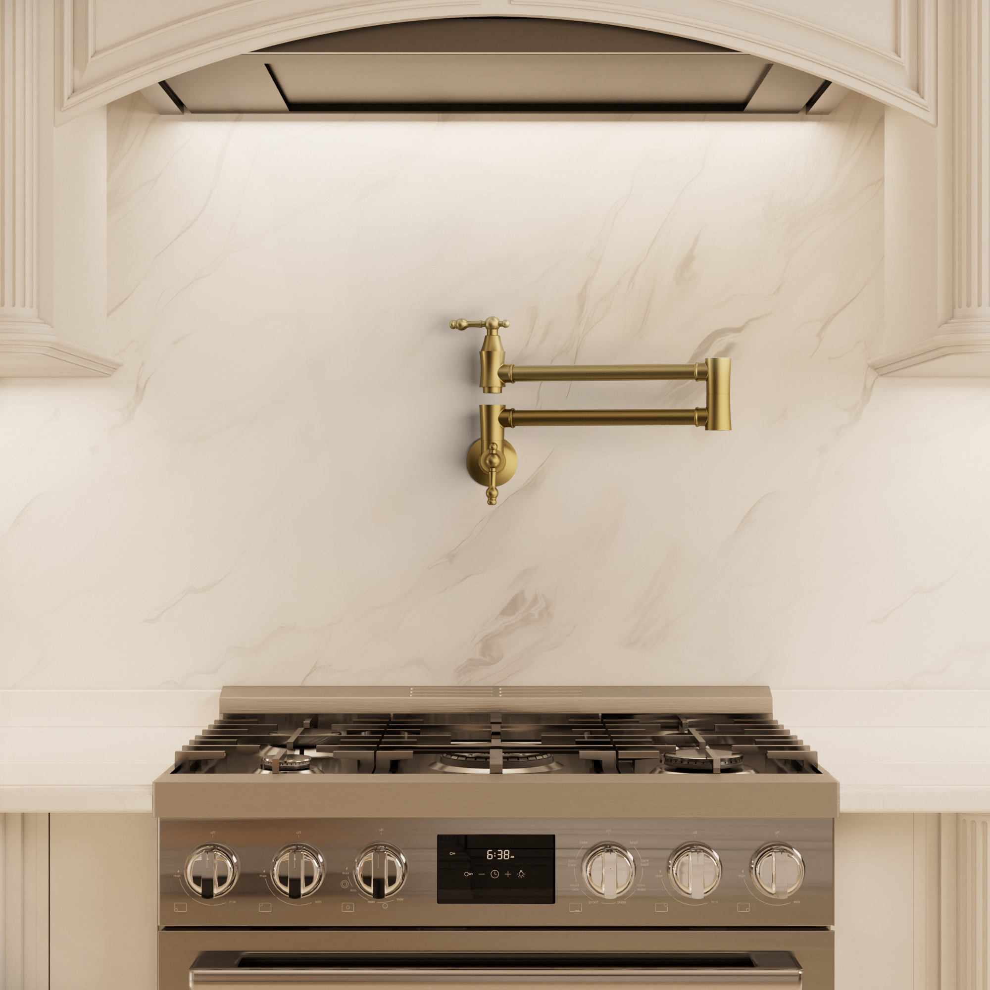 Simplify your kitchen routine with the ultimate convenience of this wall-mounted pot filler, allowing you to fill large pots directly on the stovetop without the heavy lifting. Its elegant design features a retractable dual-jointed arm that extends for use and folds away neatly when finished, while the dual handles provide precise water control. Crafted from high-quality materials with a premium, easy-to-clean finish, this faucet adds a touch of sophisticated style and professional-grade functionality to your culinary space.