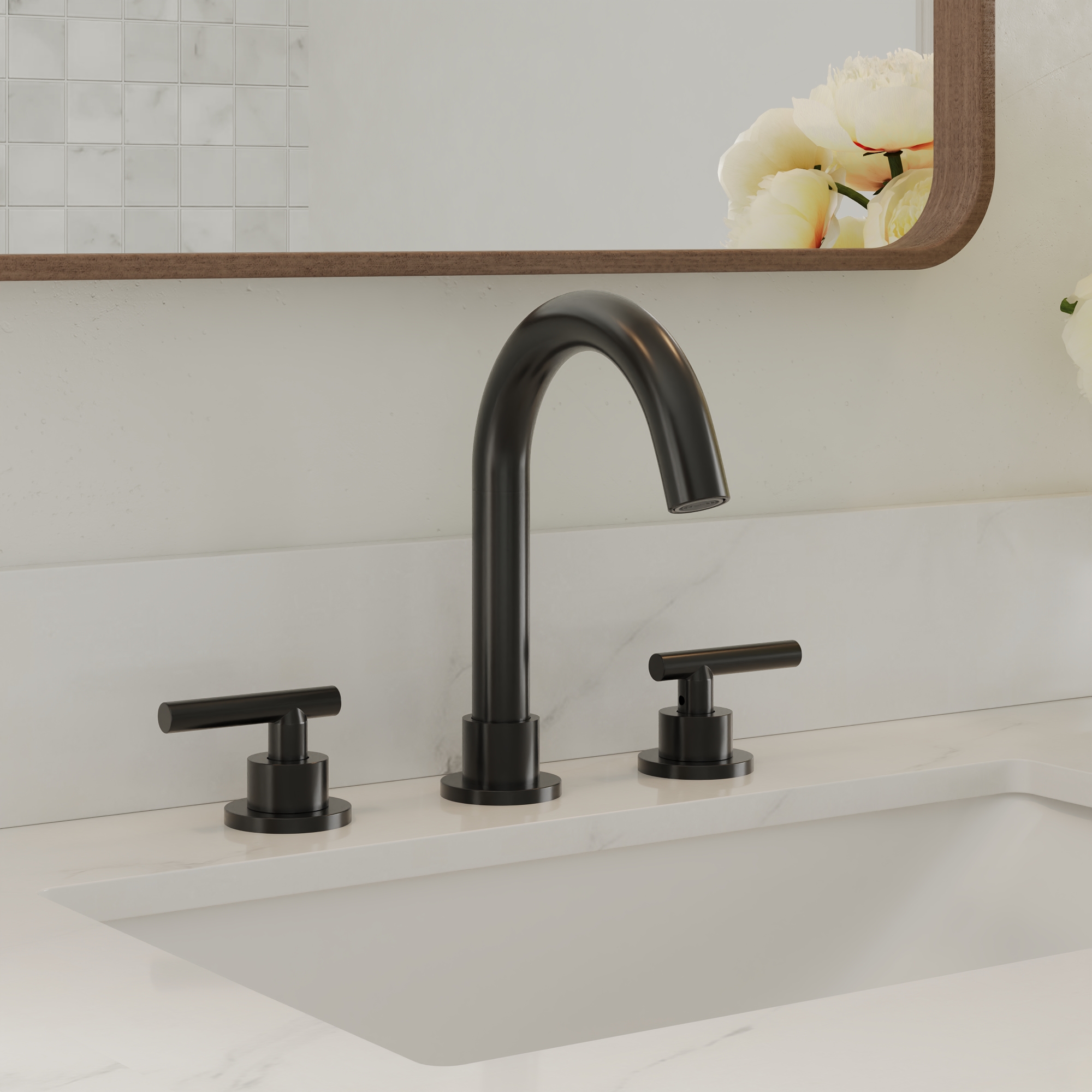 Upgrade your bathroom with this sleek 8 in. Widespread Double Handle Bathroom Faucet featuring a modern matte black finish and a 360° swivel spout for added convenience. Designed to blend seamlessly with contemporary and industrial-style bathrooms, this faucet adds a bold yet sophisticated touch to any vanity setup. The dual-handle design offers precise temperature and water flow control, while the included valve ensures easy installation and long-term durability. Pair it effortlessly with hardware, minimalist lighting, and neutral-toned tiles to create a cohesive, high-end look that enhances both functionality and style in your space.
