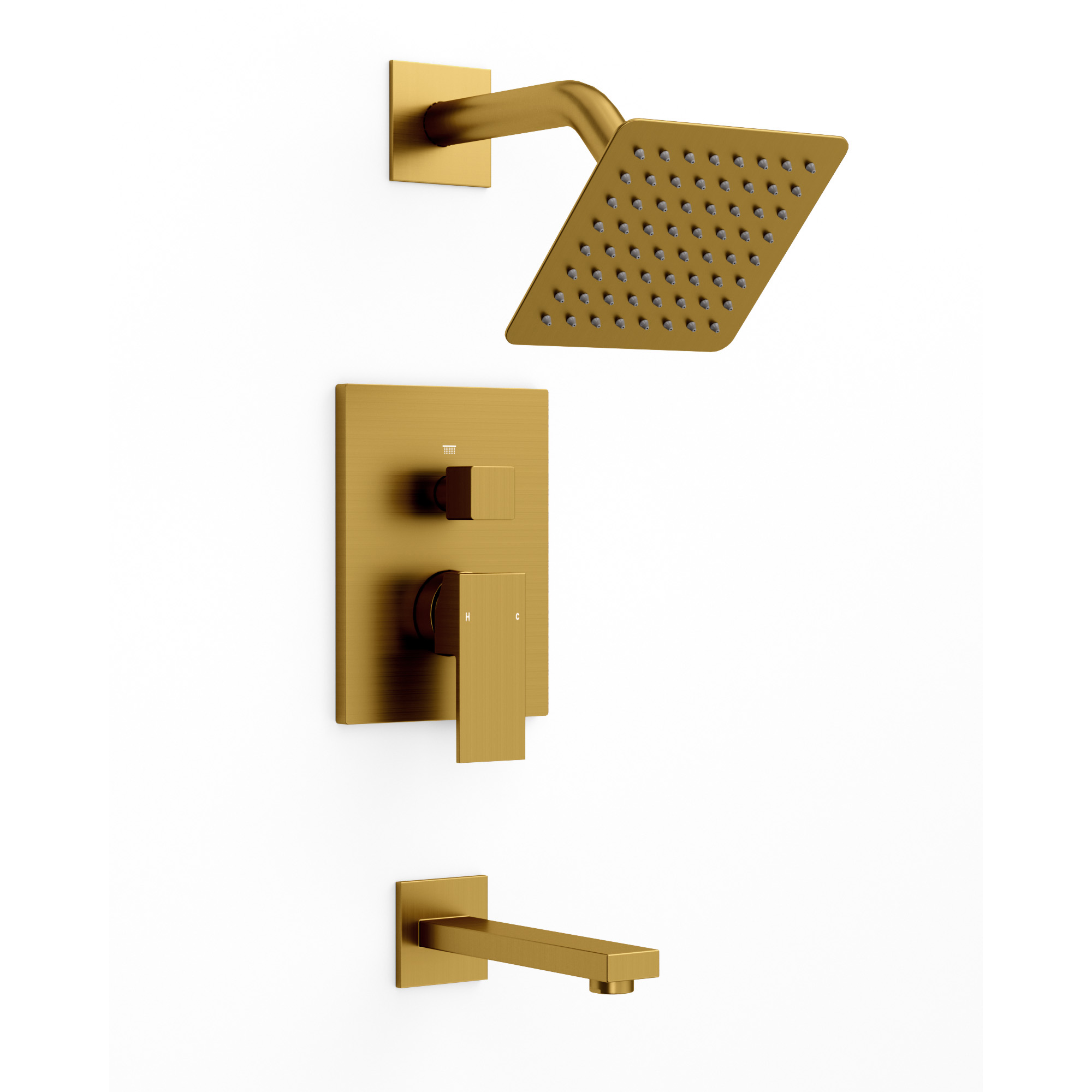 Elevate your bath experience with the Rainspire Single Handle Tub and Shower Faucet Set, featuring a sleek 6 in. ultra-thin wall-mounted shower head that delivers a smooth, rainfall-like flow for a refreshing escape. Paired with a matching tub spout and minimalist square trim, this space-saving wall-mount design blends contemporary elegance with everyday function. The solid brass construction ensures long-term durability, while the pressure-balanced valve maintains consistent water temperature for a safe, comfortable shower every time. Finished in brushed gold for a warm, sophisticated touch, this system brings refined style and performance to any modern bathroom.